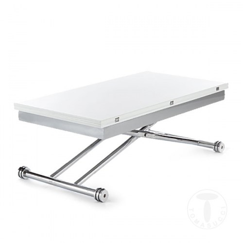 Výškově nastavitelný jídelní/konferenční stůl z bílého lesklého lakovaného MDF materiálu. Chromovaná kovová konstrukce.   Rozměry konferenční stůl: 32 x 114 x 60 cm Rozměry jídelní stůl: 77 x 114 x 120 cm   Italský design plný elegance a originality, to je Tomasucci, italský výrobce designového ná... celý popis
