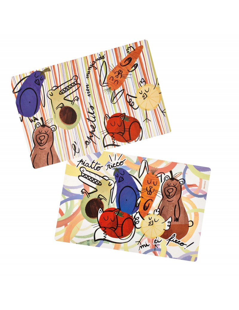 Sada 2 kusy prostírání/podložky s barevnými obrázky se zeleninou a ovocem a se zvířátky s protiskluzovým povrchem.