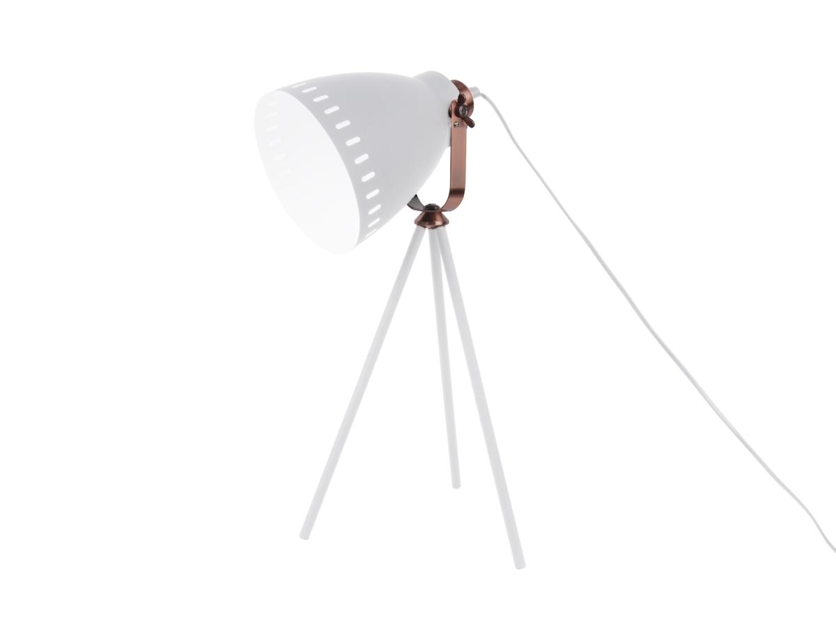 Stolní lampa na 3 nohách v bílé barvě s měděným detailem a s nastavitelným kovovým stínidlem.