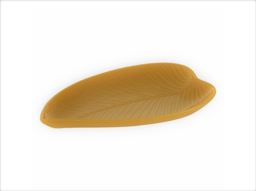 Dekorativní talíř na servírování, z britské kameniny. Servírovací talíř či tác ve tvaru zdobného listu monstery, oranžovožluté barvy, s výrazným žebrováním a lehce zvednutými okraji. Průměr 24 cm, hloubka 3,7 cm, délka 35 cm. Novinka 2021 z kolekce In the forest / V lese.