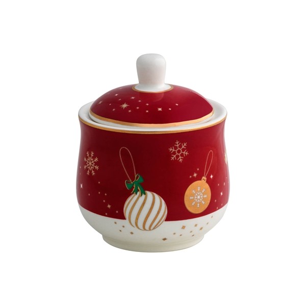 Cukřenka z porcelánu v bílé/červené/zlaté barvě s vánočním vzorem.