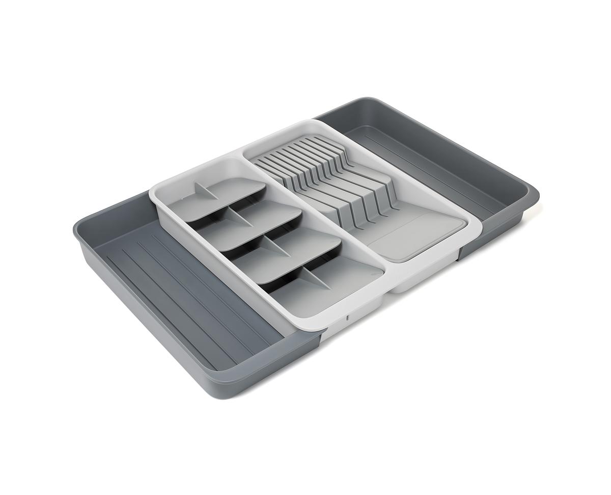 roztažitelný organizér, příbory ukládány do slotů označených ikonami, až 11 nožů – malých i velkých - k uložení do stupňovitého organizéru, hluboké přihrádky na drobnosti a roztažitelné bočnice na kuchyňské náčiní, 6,15 x 33,7 x 39,9 cm (VxŠxH)
