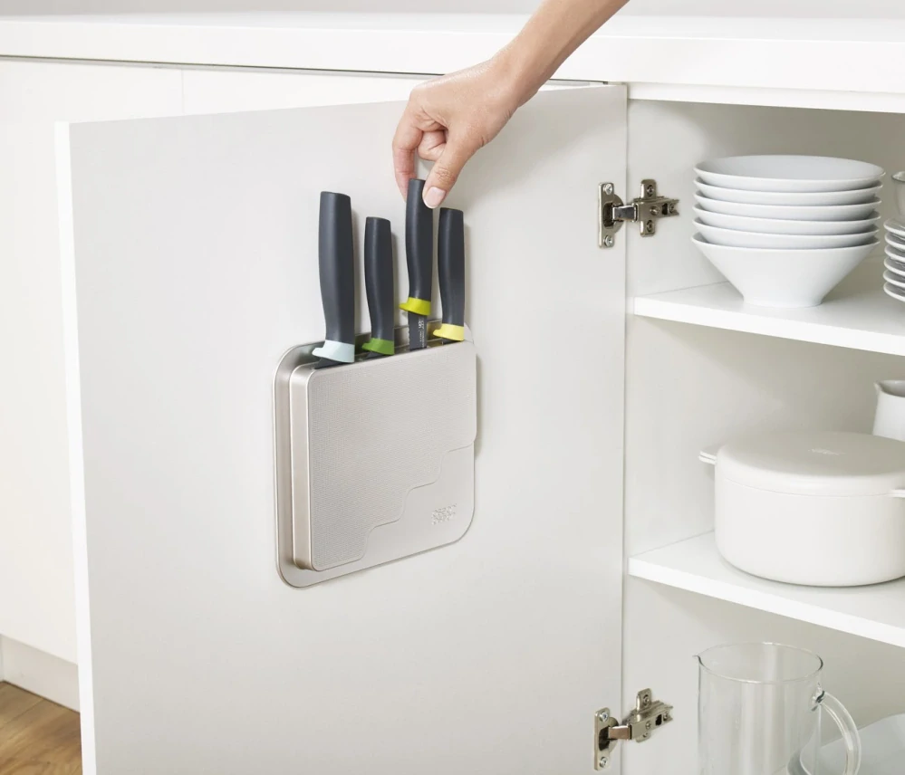 Sadu JOSEPH JOSEPH DoorStore Knives tvoří čtyři nože Elevate a ploché pouzdro na nože. Pouzdro se upevňuje 3M VHB samolepící páskou. Instalace na čistý hladký povrch je velmi snadná. Ideálním místem pro instalaci sady je vnitřní strana dvířek kuchyňské linky nebo jakýkoli podobný úzký prostor. Nože Elevate jsou vybaveny integrovanou podpěrou a nepřilnavou non-stick úpravou ostří. Při krájení neničí vitamíny v ovoci a zelenině - čepele jsou vyrobeny z japonské oceli s nepřilnavým (non-stick) silikonovým povrchem. Užitím nožů Elevate omezíte znečištění a zlepšíte hygienu pracovní plochy - ergonomická madla nožů jsou vytvarována do podpěry zajišťující, že po odložení zůstává čepel nože vždy ve výšce nad pracovní plochou. Koncept výrobku navrhl Gillian Westley / design Derek Roberts.