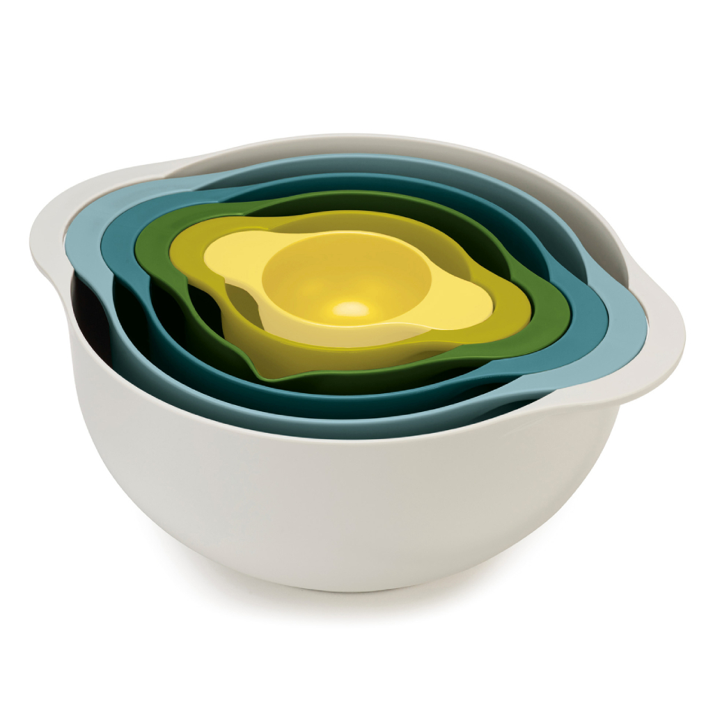 kompaktní sada, velká míchací mísa (4,5l), plastový cedník (3l), mísa (1,8l), miska s hubičkou (1l), miska (400ml), miska (150ml), 13,4 x 26,4 x 32,4 cm (VxŠxH)