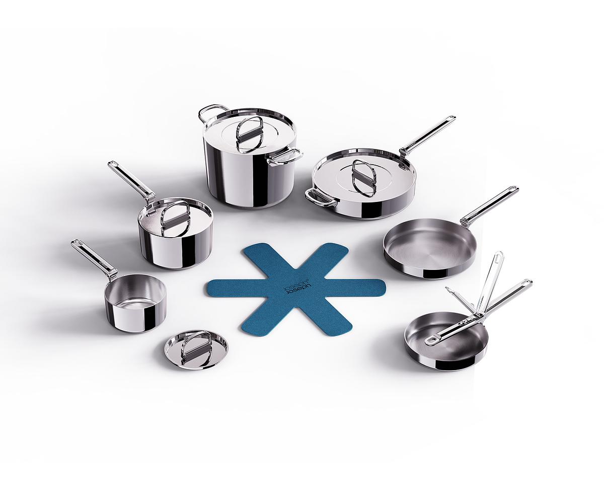 prémiová řada nádobí profesionální kvality a inovativního designu, nejkompaktnější nádobí pro prostorově úsporné skladování, leštěný vnější povrch z nerezové oceli s hliníkovým jádrem zajišťujícím rovnoměrnou distribuci tepla, vhodné pro všechny druhy sporáků a varných desek včetně indukčních, zapékání v troubě, skládací rukojeti šetřící 50% úložného prostoru