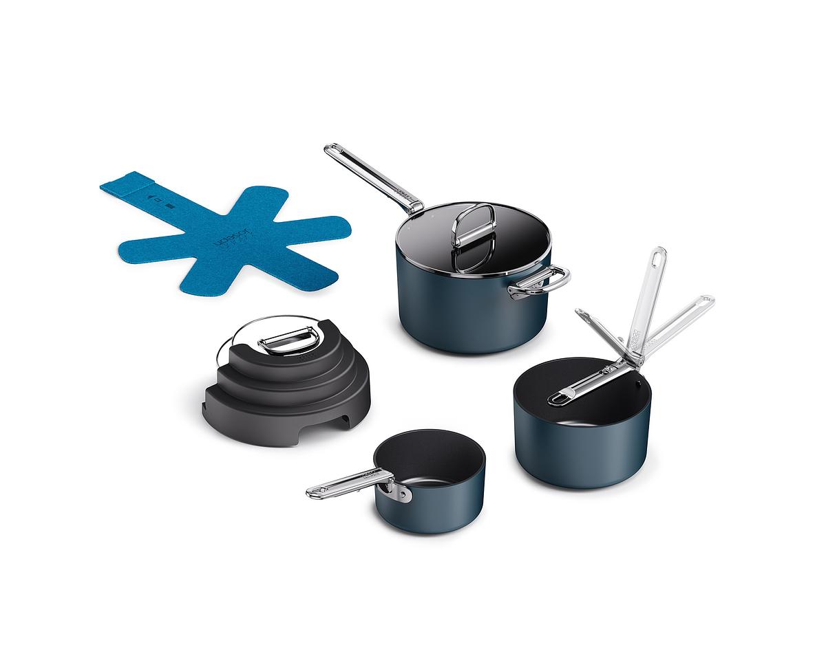 prémiová řada nádobí profesionální kvality a inovativního designu, nejkompaktnější nádobí pro prostorově úsporné skladování, těžké hliníkové korpusy zajišťující rovnoměrnou distribuci tepla, vhodné pro všechny druhy sporáků a varných desek včetně indukčních, zapékání v troubě, nepřilnavý keramický povrch, skládací rukojeti šetřící 50% úložného prostoru