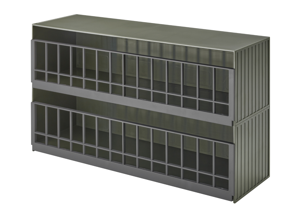 2-patrový úložný box na hračky, kovový korpus, ABS mřížky, 26,5 x 45 x 14,5 cm (VxŠxH)