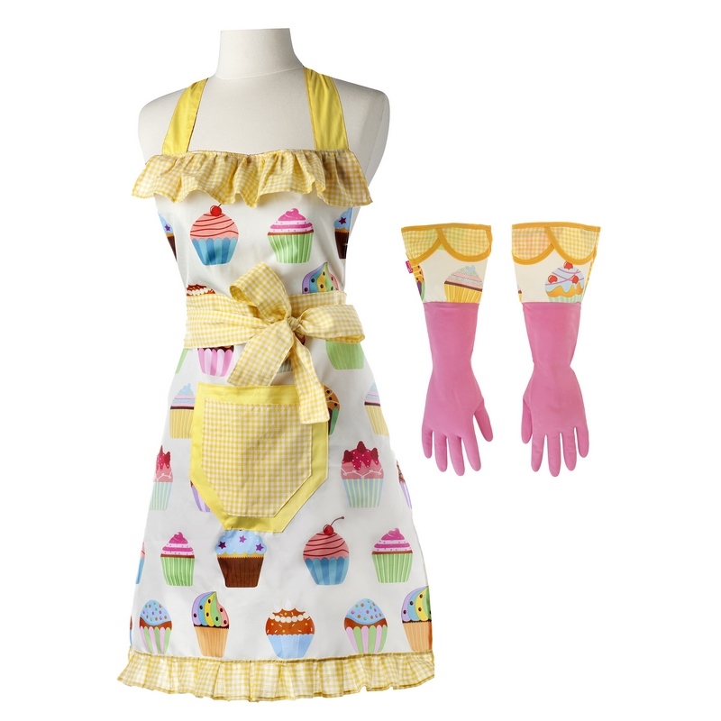 Sada se skládá z gumových rukavic se zdobenými manžetami a zástěry s přiléhavým vzorem. Obojí je univerzální velikost.